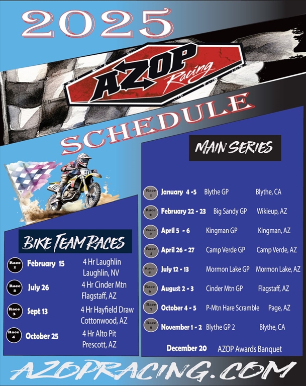 For more information e-mail kyle@azopracing.com or call (623) 363-9665.