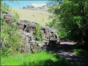At Harrington Fork there is a paved parking area and a restroom. From there you can access the single track motorcycle trail or choose from one of several very unique picnic sites. There is no camping here, day use only.