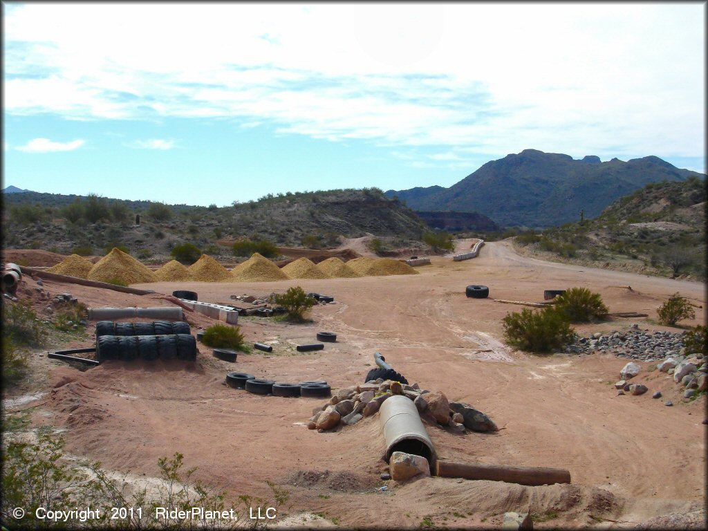 An endurocross-style obstacle course features a mix of urban and natural obstacles.